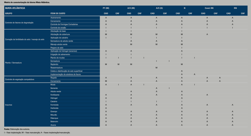 No quadro a seguir é possível visualizar os tipos de custos mais comuns em projetos de regeneração ambiental na Mata Atlântica e como eles se distribuem em cada fase. Sendo as siglas I – fase de implantação; M – fase de manutenção; M – ambas as fases.