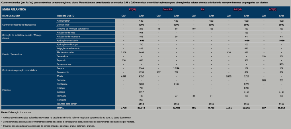 O relatório verificou que a grande maioria das técnicas, principalmente nas mais intensivas, os custos de aquisição de insumos para ações de restauração são expressivamente importantes. Também se observa que os gastos para cercamento e aceiramento encareceram os projetos, embora tenham função fundamental em locais onde o gado e a ocorrência de incêndios representam ameaça à restauração. O custo total de instalação do metro linear de cerca pode chegar a R$ 22,50 na Mata Atlântica, o que pode corresponder a 47%, no cenário desfavorável, e 31%, no cenário favorável, do valor total do projeto de restauração. A adoção de cercas vivas ou materiais alternativos podem diminuir esses gastos.